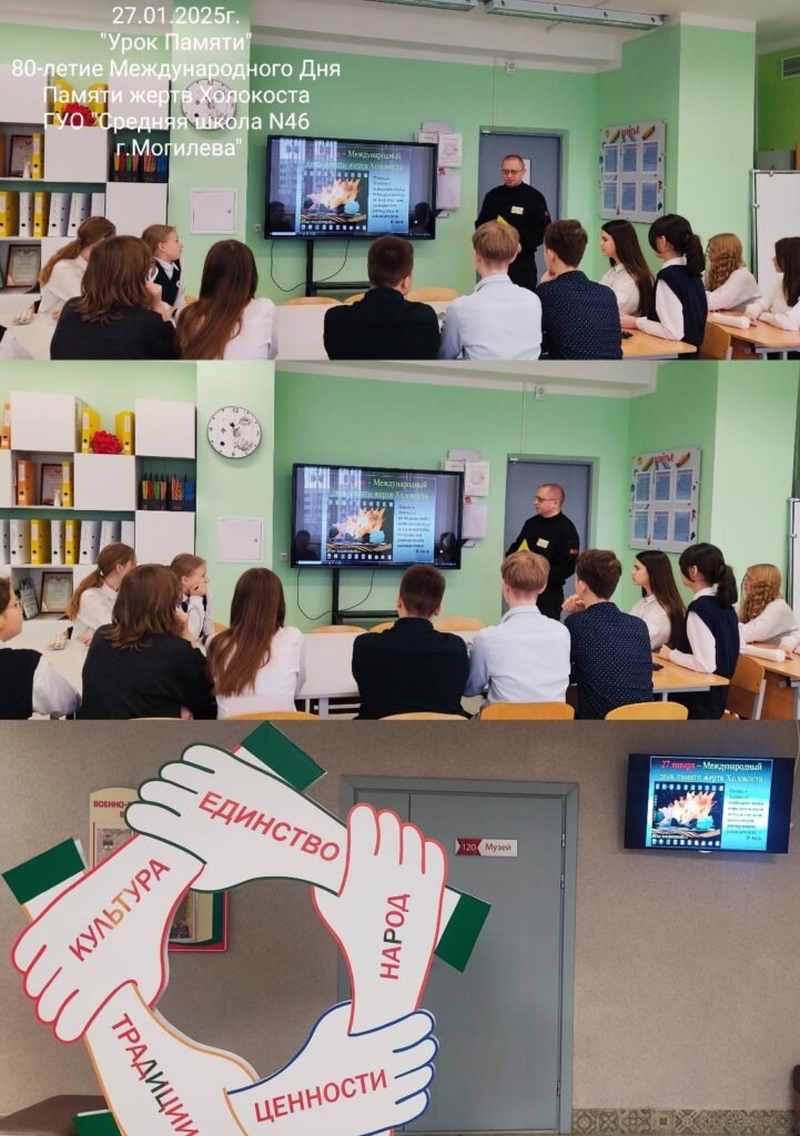 27 января во всем мире отмечают Международный день Памяти жертв Холокоста – массового уничтожения населения в Европе нацистами и их помощниками по этническому, социальному, медицинскому и другим признакам. Школьный день в ГУО «Средняя школа №46 г.Могилева» начался с демонстрации видеофильма Памяти. Педагоги рассказали детям о том, что в этот день 80 лет назад 27 января 1945 года войсками Советской Армии были освобождены узники лагеря смерти «Аушвиц», расположенного около польского города Освенцим. За 1941 – 1945гг жертвами преступлений нацистов и их пособников стали около шести миллионов евреев. Школьники узнали, что в первые месяцы оккупации практически во всех крупных белорусских городах и местечках были созданы гетто – специально огороженные и охраняемые районы, куда сгоняли все еврейское население для работы и последующего уничтожения. На территории нашей страны фашистами был создан один из крупнейших гетто – «Малый Тростенец» в окрестностях Минска, в котором жертвами фашистов стали более ста тысяч человек. В заключении урока учащиеся отметили, что эту память необходимо передавать из поколения в поколение, чтобы ужасы фашизма не повторились вновь.